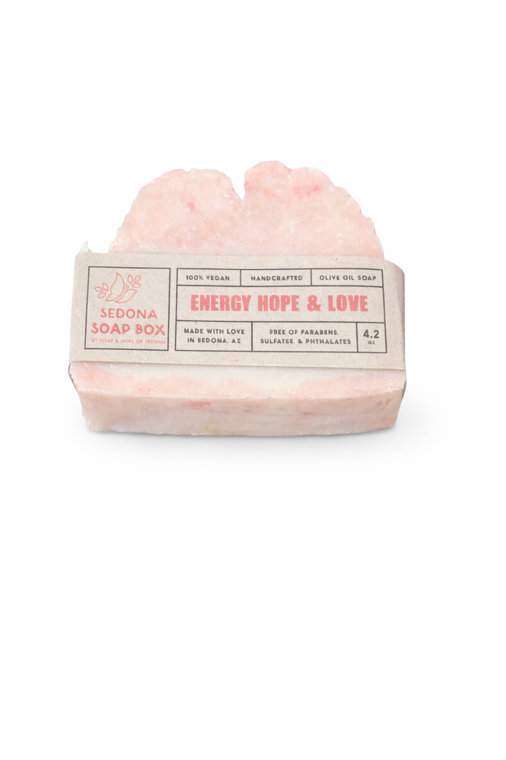 Bright, cheerful, and uplifting, Energy Hope & Love is a fresh, citrus-forward scent with a clean, lightly sweet finish that feels like instant good vibes. Handcrafted in Sedona, Arizona, this vegan olive oil soap creates a creamy lather that leaves your skin feeling clean and refreshed—perfect for morning showers or a midday reset.